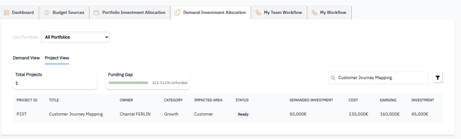 - The Investment Planning module reflects confirmed investment in the Demand Investment Allocation – Project View