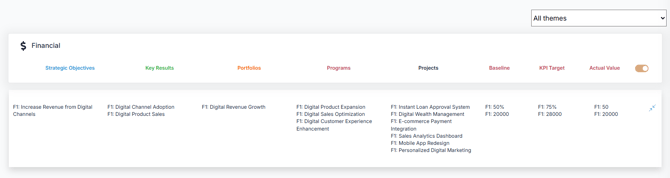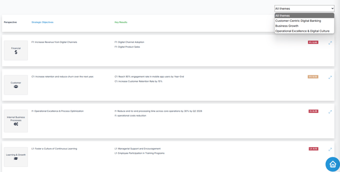 Once validated, your strategy becomes available in a dedicated visual view (iTransform365 view or Balanced Scorecard View) based on the selected framework. Click the icon