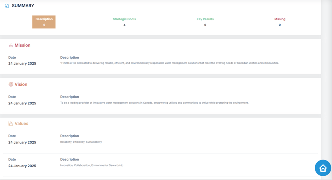 It enables your organization to define its vision, mission, core values, and long-term strategic goals, and to translate them into trackable outcomes using a chosen strategy framework.