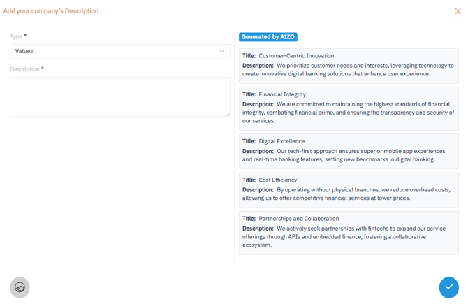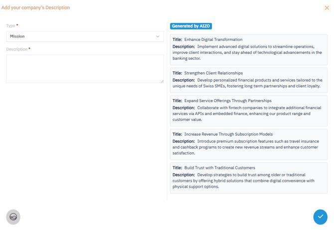 •  Enter a detailed description of your mission. Click AIZO  for AI-generated suggestions.