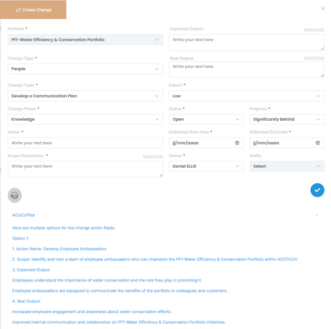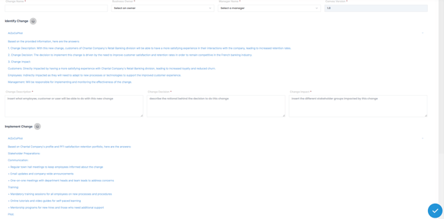 to review AI-generated suggestions based on your context and industry. Copy, customize, and paste the recommendations directly into the appropriate fields to save time and enrich your Change Canvas.