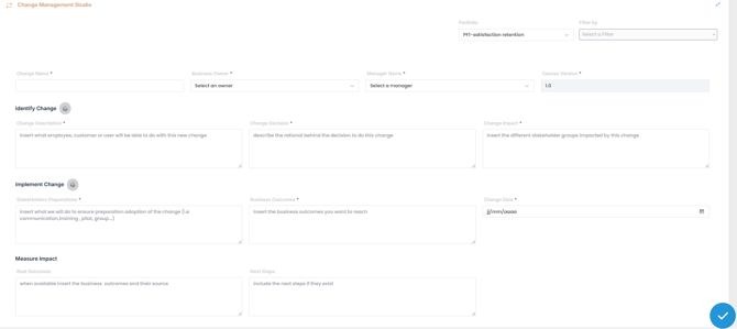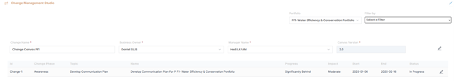 The Change Canvas captures the context, reasoning, and outcomes associated with the portfolio-level change.