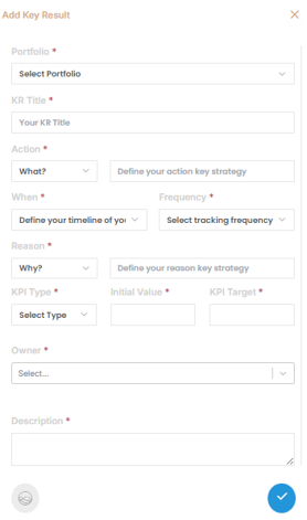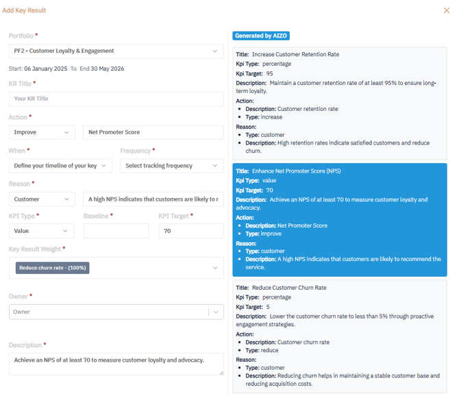 💡 Tip:  Click AIZO   to receive AI-powered suggestions for Key Result actions, metrics, and targets—tailored to your portfolio’s strategy, industry trends, and organizational context. You can select and paste these recommendations directly into your Key Result form.