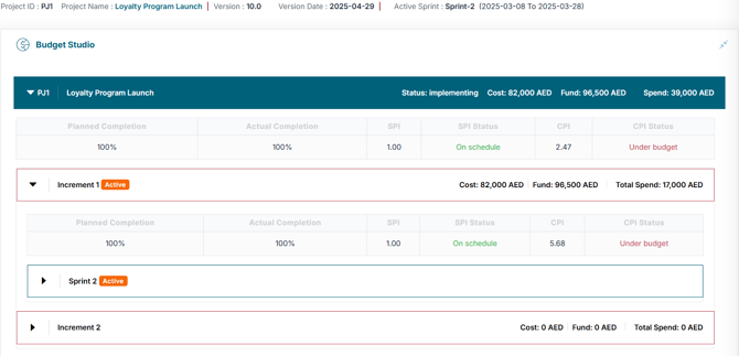 Within the Budget Studio, performance metrics are available at the Project, Value Increment, and Sprint levels, including: