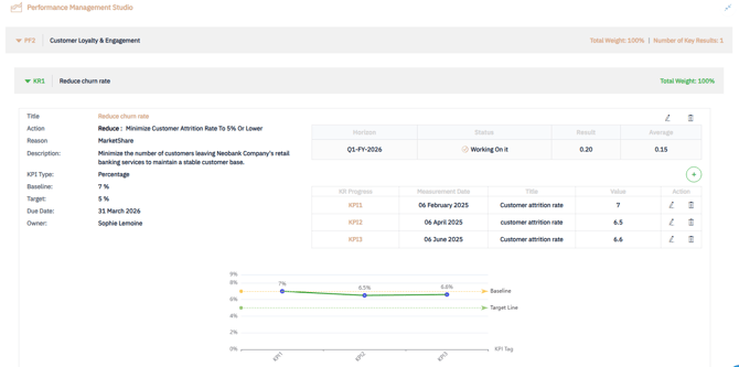 The Performance Management Studio enables you to track the progress of Key Results (KRs) across your portfolio. This tool helps portfolio managers monitor strategic execution in real time by capturing performance data, visualizing trends, and scoring progress on a 0 to 1 scale. By regularly updating KRs, you can ensure alignment with strategic goals, identify performance gaps, and make informed, data-driven decisions.