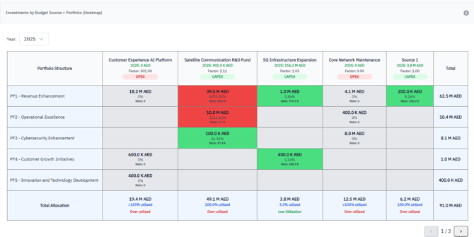 The heatmap shows how investments from budget sources are allocated across portfolios.