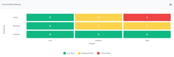 The Financial Risk Heatmap visualizes financial risks based on their probability and impact, using a color-coded risk severity scale.
