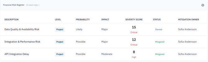 The Financial Risk Dashboard provides a consolidated, portfolio-level view to identify, assess, monitor, and mitigate financial risks across portfolios, programs, and projects.