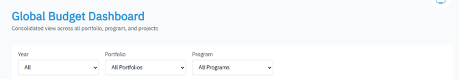 The Global Budget Dashboard provides a consolidated view of budgets, spending, and forecasts across all portfolios, programs, and projects.