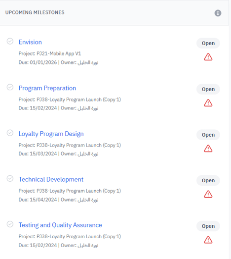 Displays all upcoming milestones for the selected program(s), including:
