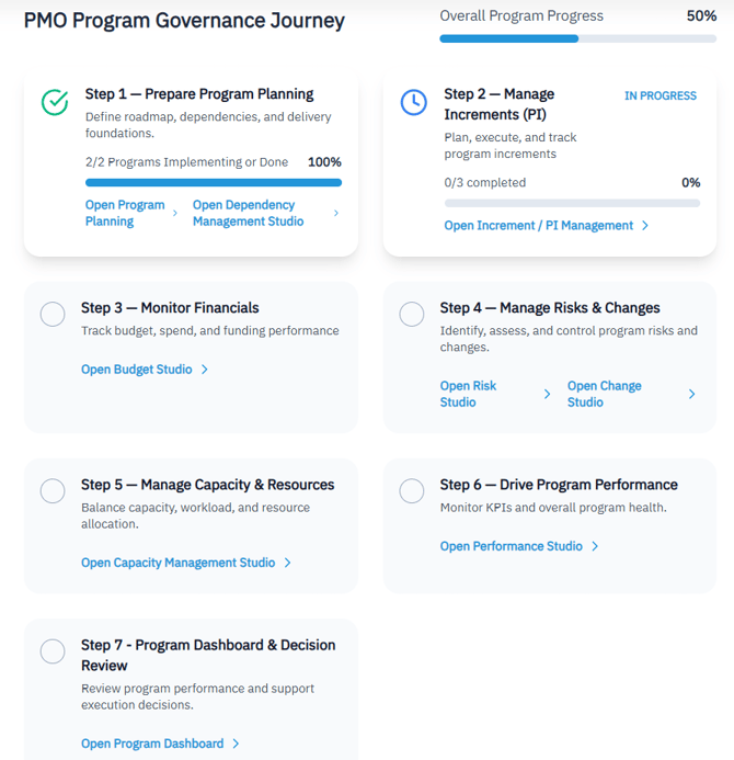 The Program Execution Center empowers PMOs and Program Managers with a single, role-focused workspace to orchestrate delivery, manage constraints, and drive performance across multiple projects.