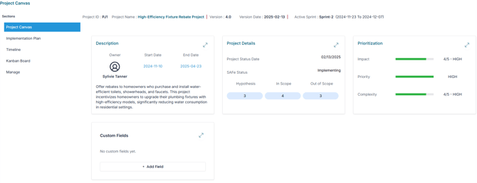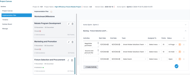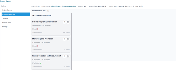 The Project Canvas offers a dedicated section for defining and managing the Implementation Plan, serving as your central tool for organizing, tracking, and executing project delivery effectively.
